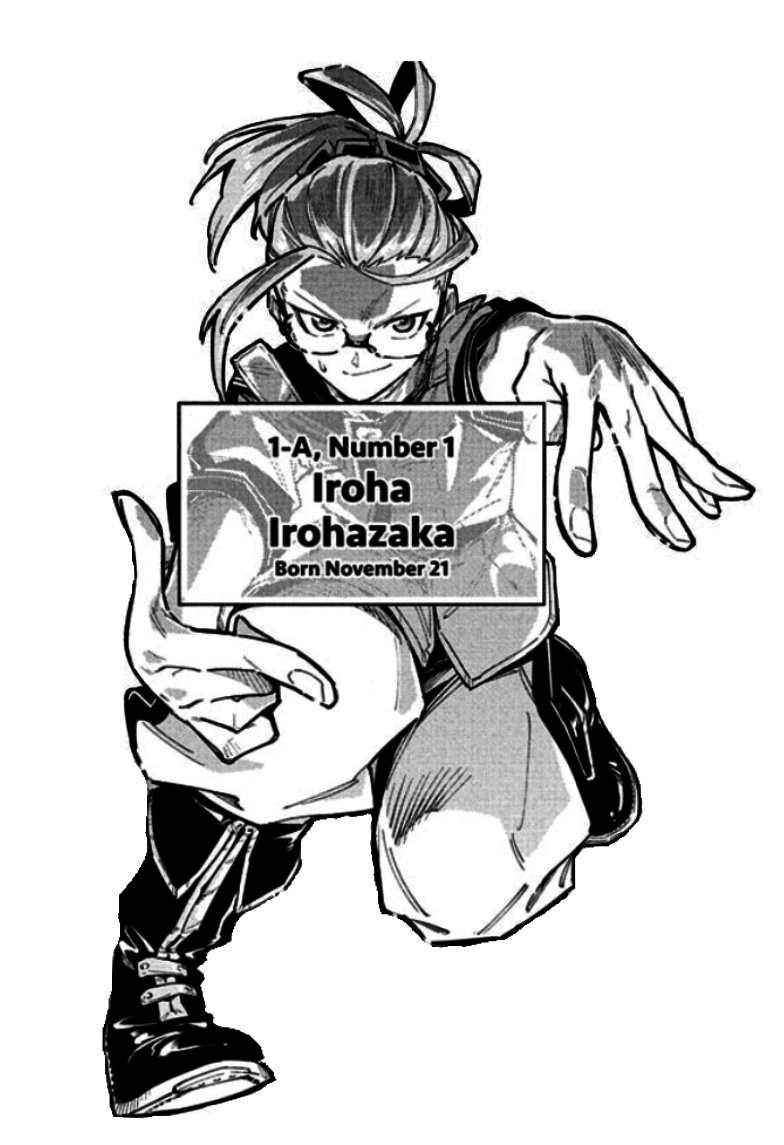 When solving codes, Iroha ties his hair up using the hair tie given to him by Tayu Yugata, and dons one of the glasses weapons that Kogoe Horagatoge made for Class 1-A in the early chapters. His glasses have rectangular frames with a camera on the nose bridge, allowing Kogoe to see everything he is doing. The glasses weapon helps Iroha crack any code thrown at him. Iroha also holds one of the 10 of the glasses weapons that allow Class 1-A to enter the Digital Cipher Academy.